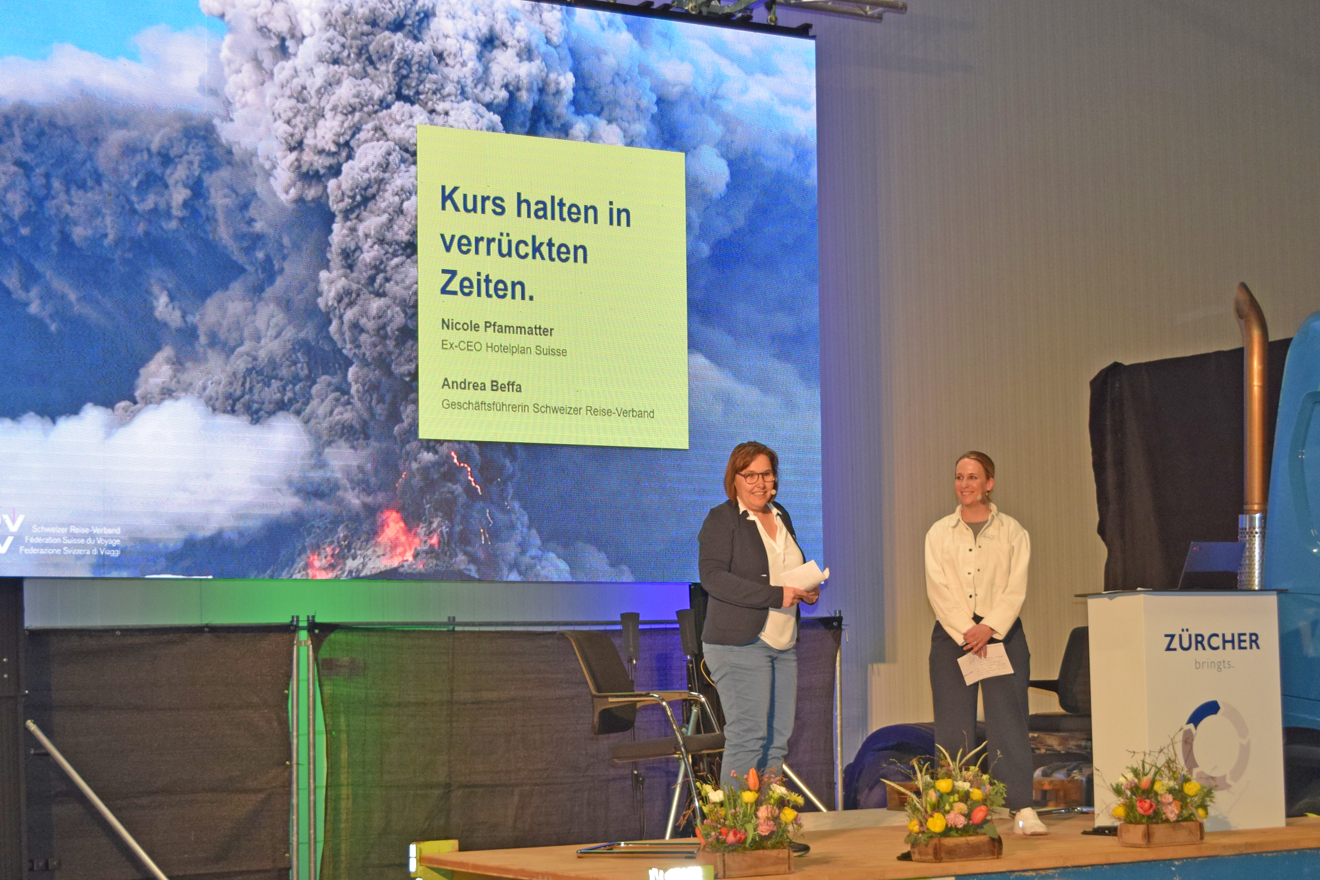 Gestärkt ging es im Anschluss weiter mit unserem Gäste-Act. Dieses Jahr durften wir Andrea Beffa, Geschäftsführerin des Schweizer Reise-Verbands (SRV), sowie Nicole Pfammatter, ehemalige CEO von Hotelplan Suisse, begrüssen. Unter dem Thema «Kurs halten in verrückten Zeiten» gaben sie spannende Einblicke und teilten wertvolle Erfahrungen aus der Reisebranche.